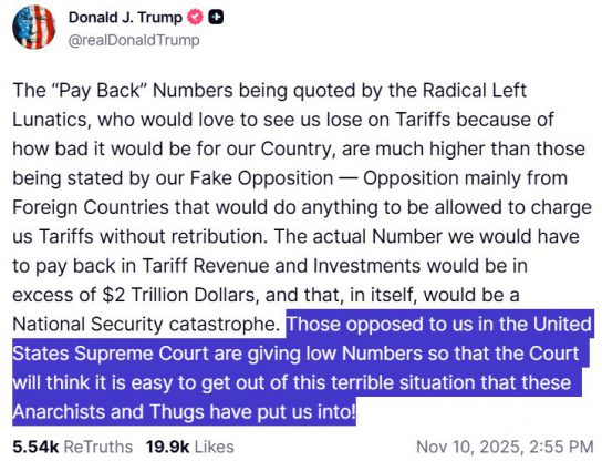 Update 11/12: Trump wildly overstates the amount of tariffs collected; based on media reports it’s more in the neighborhood of $150 billion. Not nothing, but not nearly the number Trump claims.